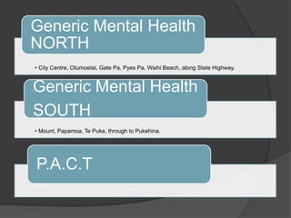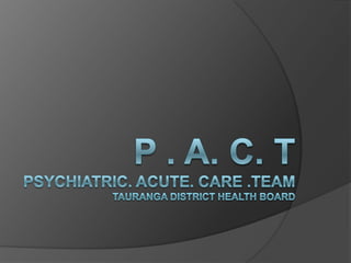 The document describes the roles and responsibilities of the P.A.C.T. mental health team in the north region, which is led by Michelle Loury and responds to individuals in mental health crises through assessments, referrals, treatment, and 6 month follow ups. It provides details on how the team operates, the types of issues they see, and their process for assessing and supporting clients in various locations throughout the community.