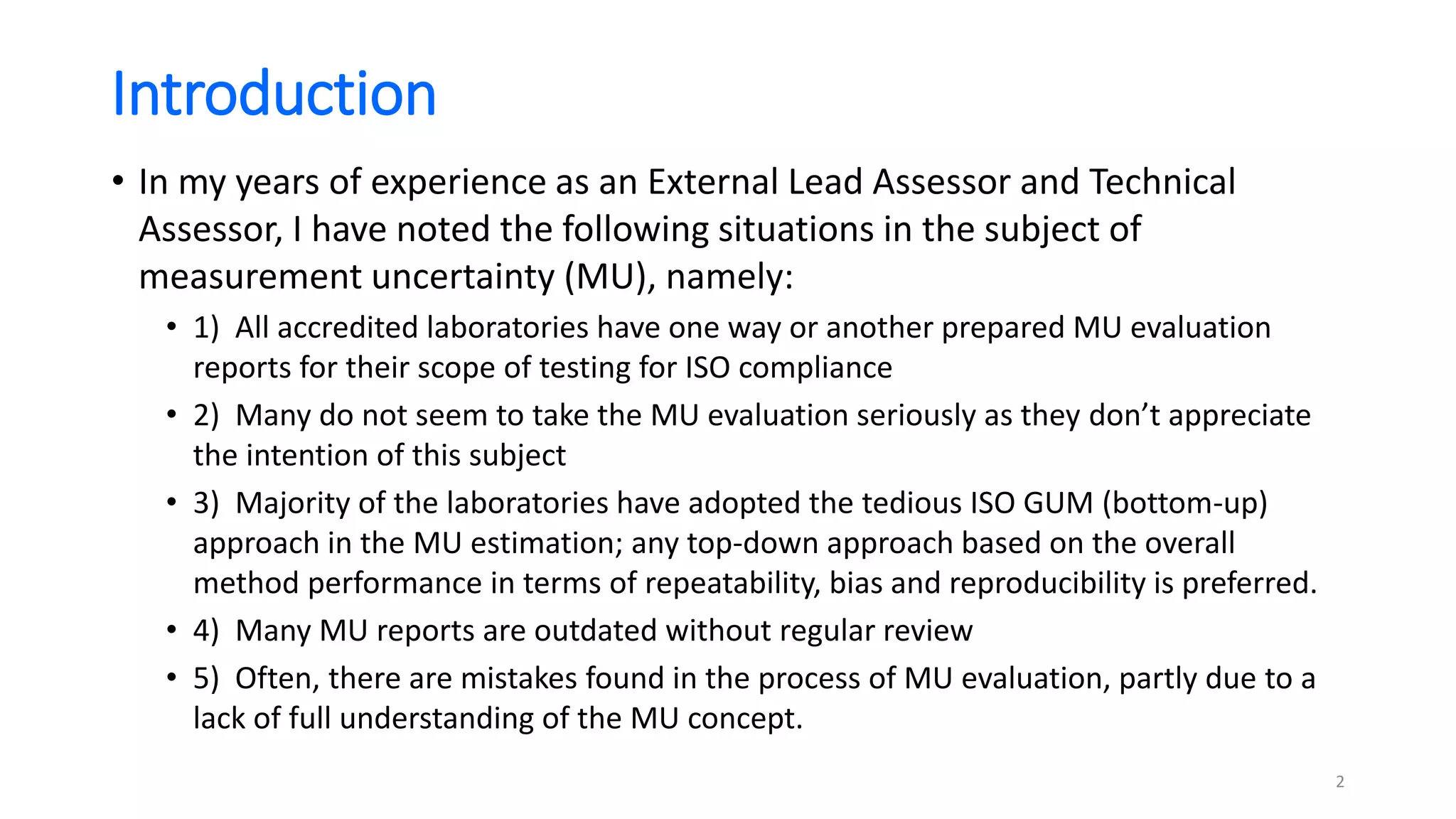 The document presents a webinar discussing common mistakes in evaluating measurement uncertainty (mu) in laboratory settings. It emphasizes the importance of understanding mu for accuracy, compliance with ISO standards, and confidence in test results, while also highlighting issues such as outdated reports and improper calculation methods. Key concepts include the propagation of uncertainty, the difference between bottom-up and top-down approaches, and the significance of consistent units in mu calculations.