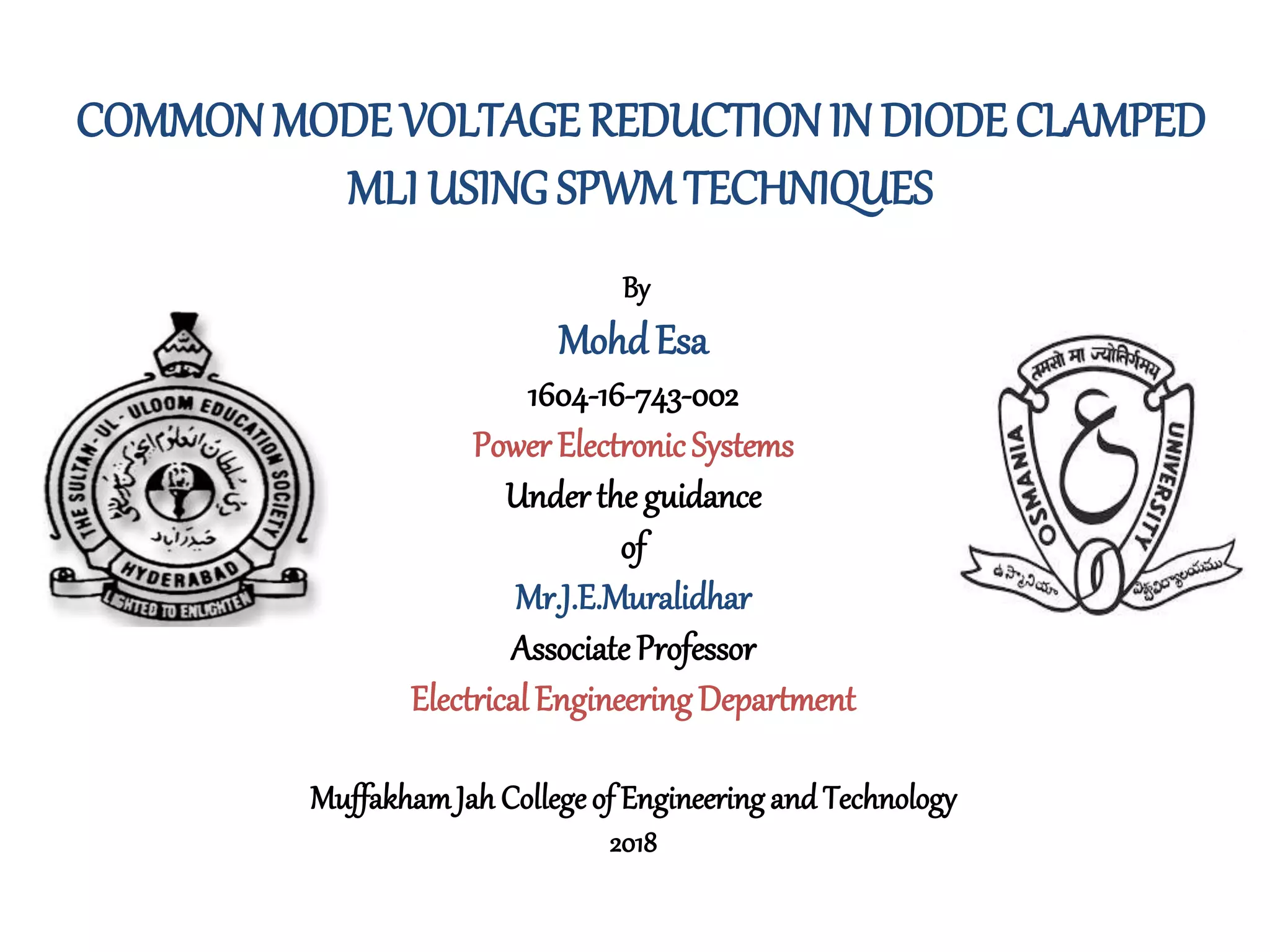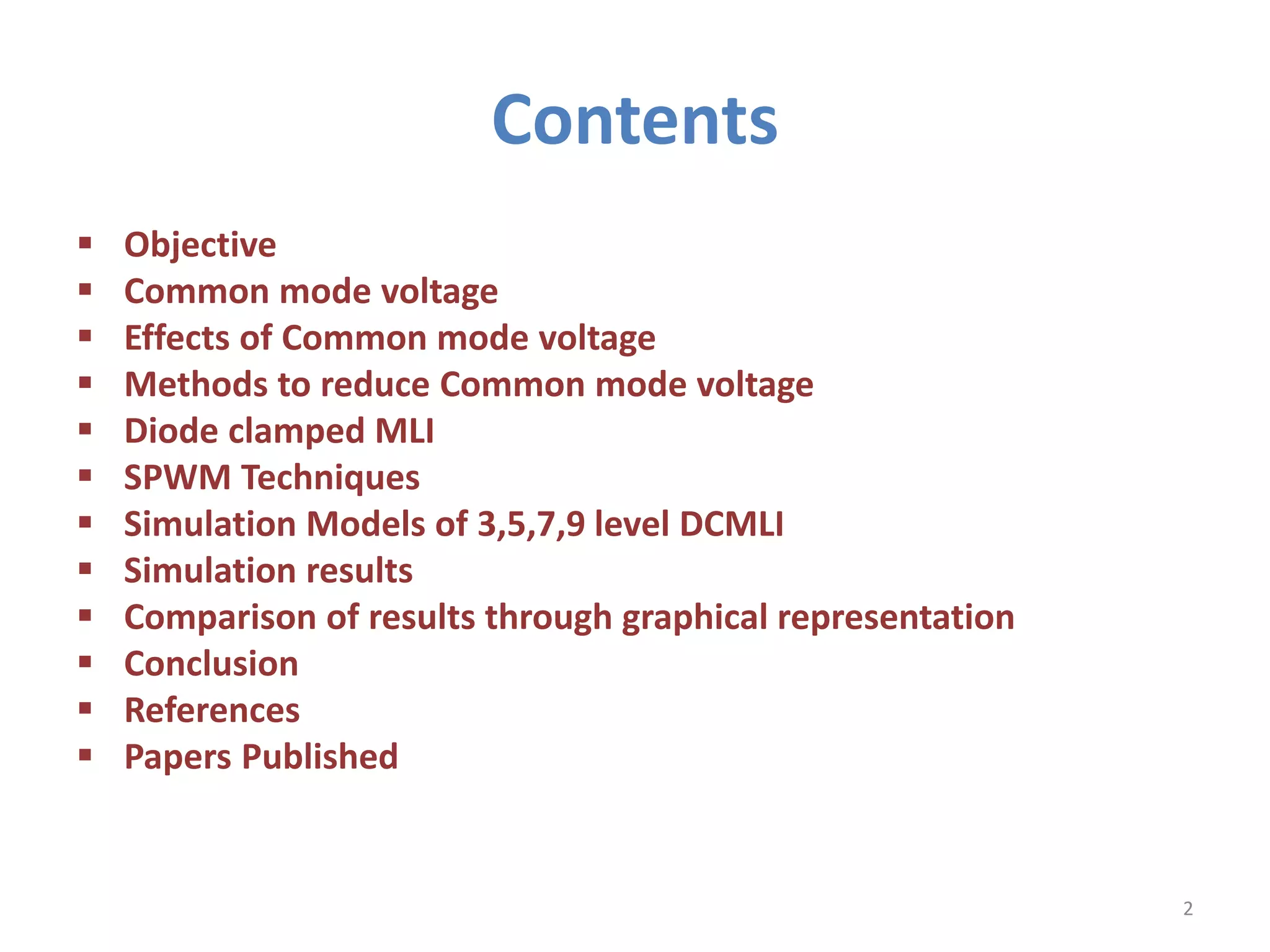 This document discusses techniques to reduce common mode voltage in diode clamped multilevel inverters using sinusoidal pulse width modulation. It presents simulation results comparing phase disposition, phase opposition disposition, and alternative phase opposition disposition SPWM methods in 3-level, 5-level, 7-level and 9-level inverters. The zero common mode SPWM technique is also analyzed, showing it can eliminate common mode voltage. Simulation results show that higher level inverters and carrier disposition techniques like alternative phase opposition disposition more effectively reduce common mode voltage and total harmonic distortion.