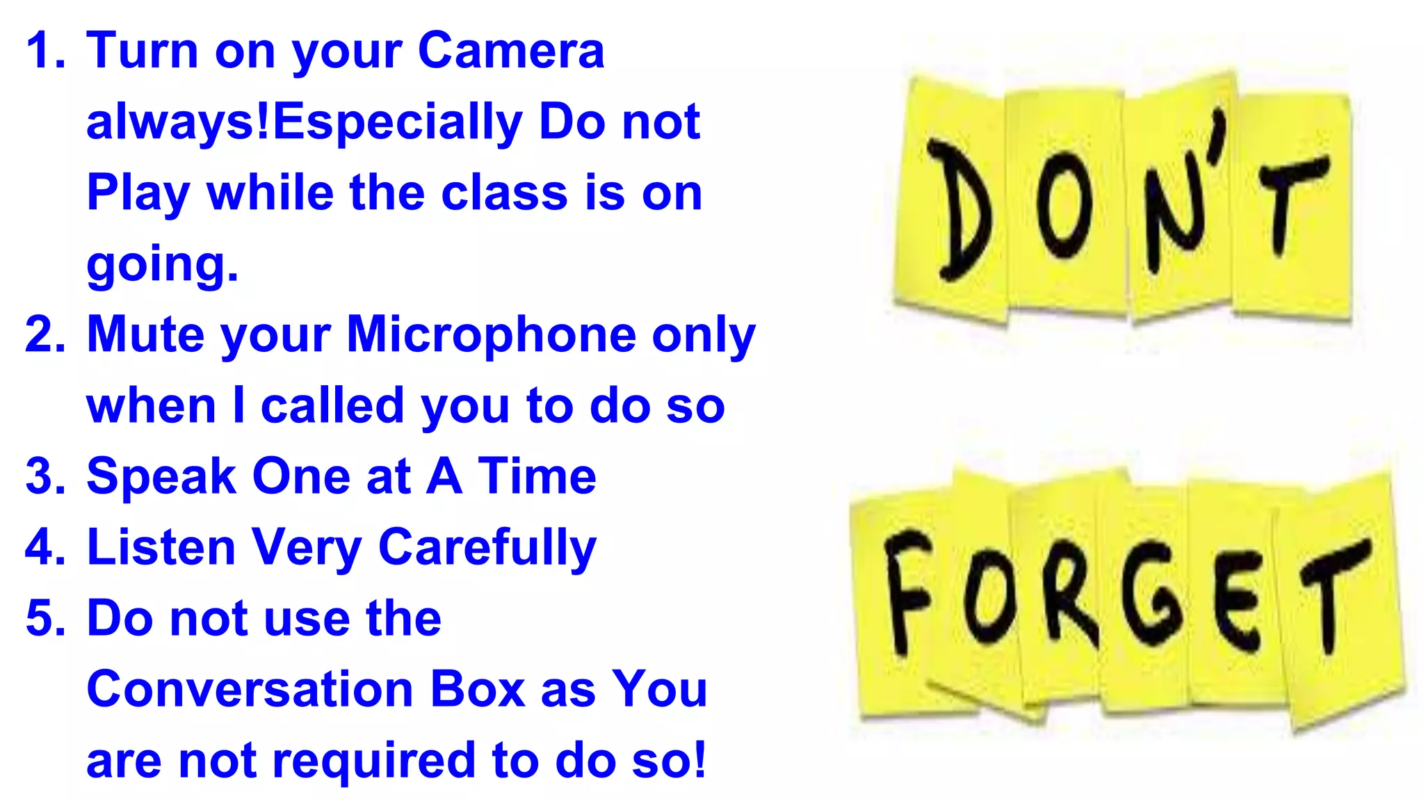 1. Turn on your camera and mute your microphone only when instructed to do so. Listen carefully and speak one at a time without using the conversation box.