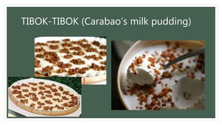 This document lists various native delicacies commonly found in the Philippines, including Tibok-tibok which is a carabao's milk pudding, Cebuano corn pudding, Budbud pilipit, Maja de ube, Ginataang pinipig, and recipes for milk puto, Butse-Butse, Binagol, Maja blanca, Putong bigas, Bibingka cassava, Puto with cheese, Bibingkang malagkit, Bibingkang galapong, Corn maja, Champorado, Simple kutsinta, Brown sugar kutsinta, Espasol, and Ube halaya.
