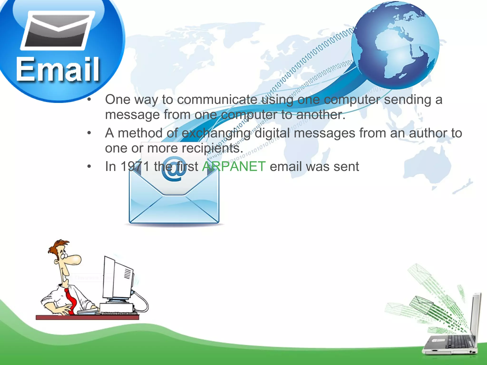 - Email is digital messages sent from one computer to another and the first was sent in 1971. Blogs are websites with discrete posts displayed in reverse chronological order, known as "weblog" since 1997. Chat involves real-time text messaging between users, starting with Talkomatic in 1974. URLs identify web resources and were standardized in 1994. Bookmarking enables users to save and share web document links, starting with del.icio.us in 2003.