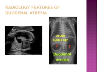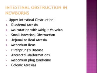 1. Duodenal atresia, malrotation with midgut volvulus, jejunal/ileal atresia as causes of intestinal obstruction.