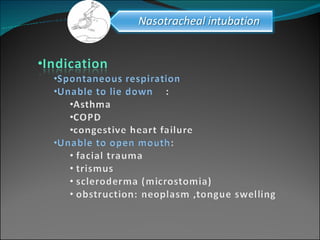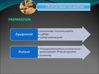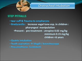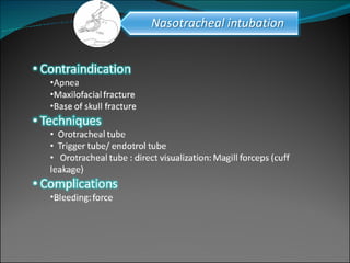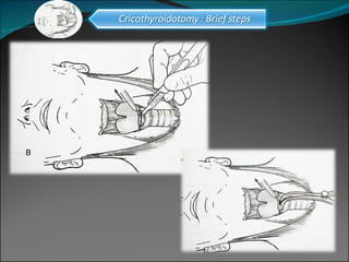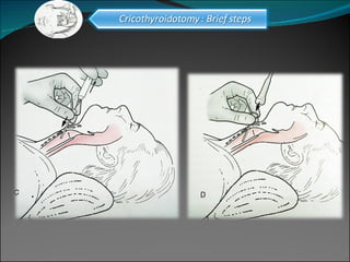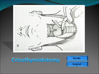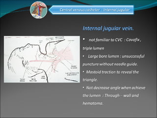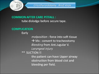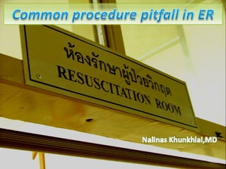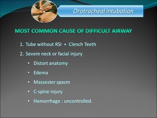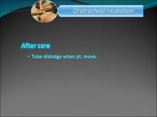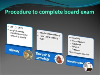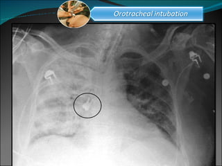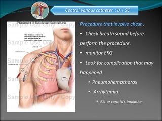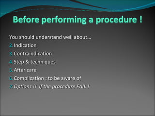 This document discusses various medical procedures including endotracheal intubation, central line placement, needle decompression, and intraosseous access. It covers indications, contraindications, techniques, complications, and emphasizes the importance of understanding each procedure well, having alternatives if the initial attempt fails, and ensuring patient safety after completion.