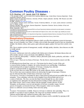 This document summarizes several common respiratory diseases that affect poultry, including chickens, turkeys, ducks, geese and other birds. It describes the clinical signs, transmission, treatment and prevention for each disease. The diseases discussed include: fowl pox, Newcastle disease, infectious bronchitis, quail bronchitis, avian influenza, infectious coryza, infectious laryngotracheitis, and turkey rhinotracheitis. For each disease, the document provides details on the species affected, symptoms, how it spreads, potential treatments, and prevention methods such as vaccination and sanitation practices.