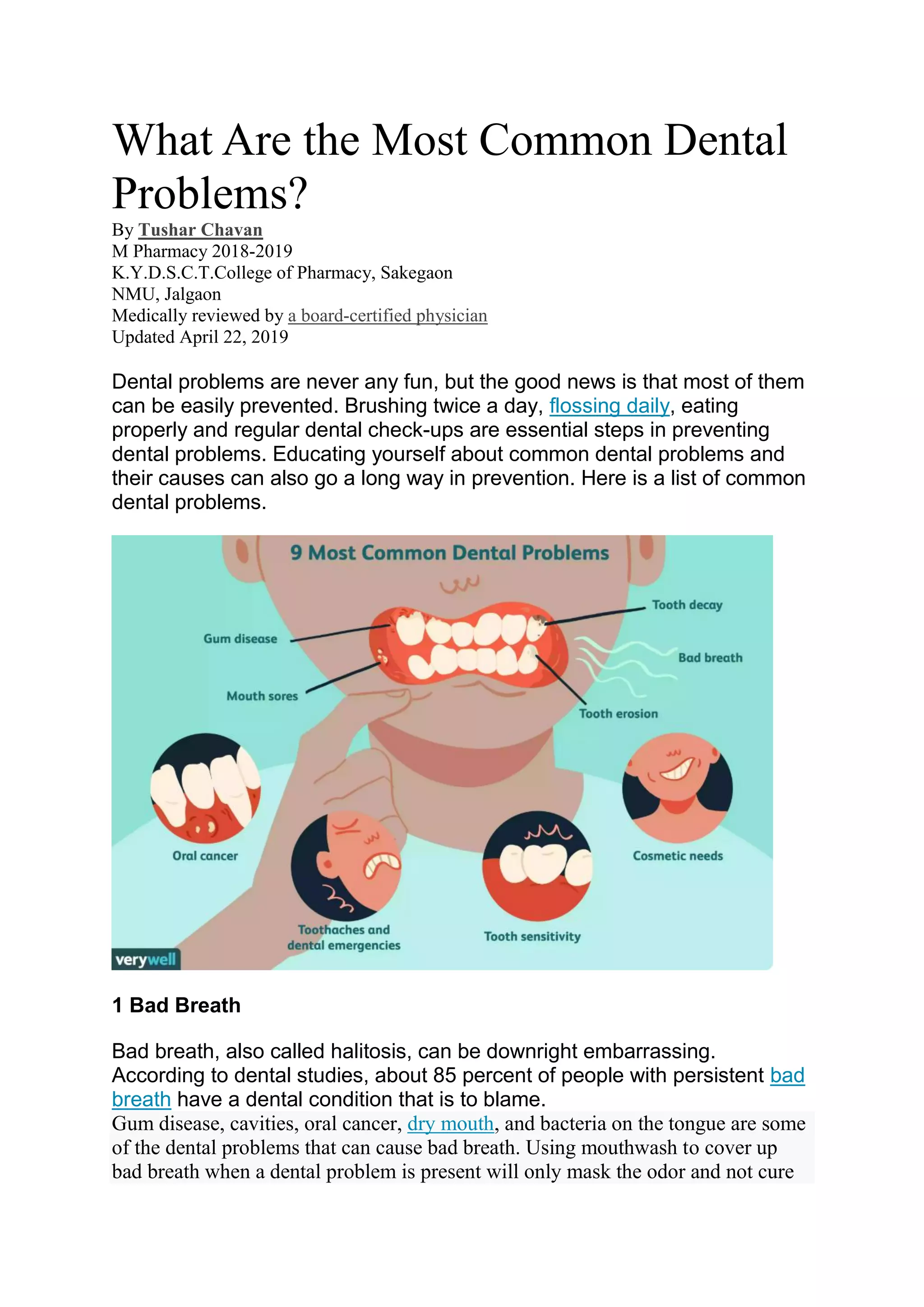 Common dental problems include tooth decay, gum disease, bad breath, oral cancer, mouth sores, tooth erosion, tooth sensitivity, toothaches, and unattractive smiles. Many dental problems can be prevented through proper brushing, flossing, regular dental checkups, and a healthy diet. It is important to see a dentist if any dental issues like pain, bleeding gums, lumps or sores in the mouth arise, as some problems could lead to tooth loss or other health issues if left untreated.