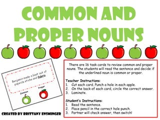 This document provides instructions for an activity involving 16 task cards that ask students to identify common and proper nouns. Students will read each sentence on the cards and determine whether the underlined noun is common or proper by placing their pencil in the correct hole punch. The teacher should cut out and laminate the cards, circling the correct answers, while the student's instructions are to read each sentence and have their partner check their answer before switching cards.