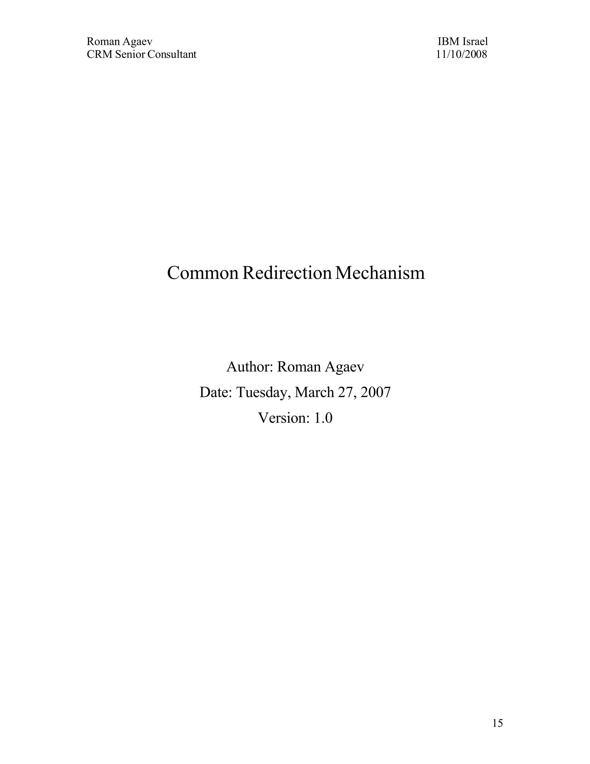 This document proposes a common redirection mechanism for Siebel applications that provides additional client-side redirection and authorization. It analyzes using server-side and client-side redirection approaches. The design injects HTML/JavaScript code into a Siebel business component field for redirection. This allows redirecting unauthorized users to an authorization page. The approach reuses existing Siebel features and common design paradigms established in other documents.