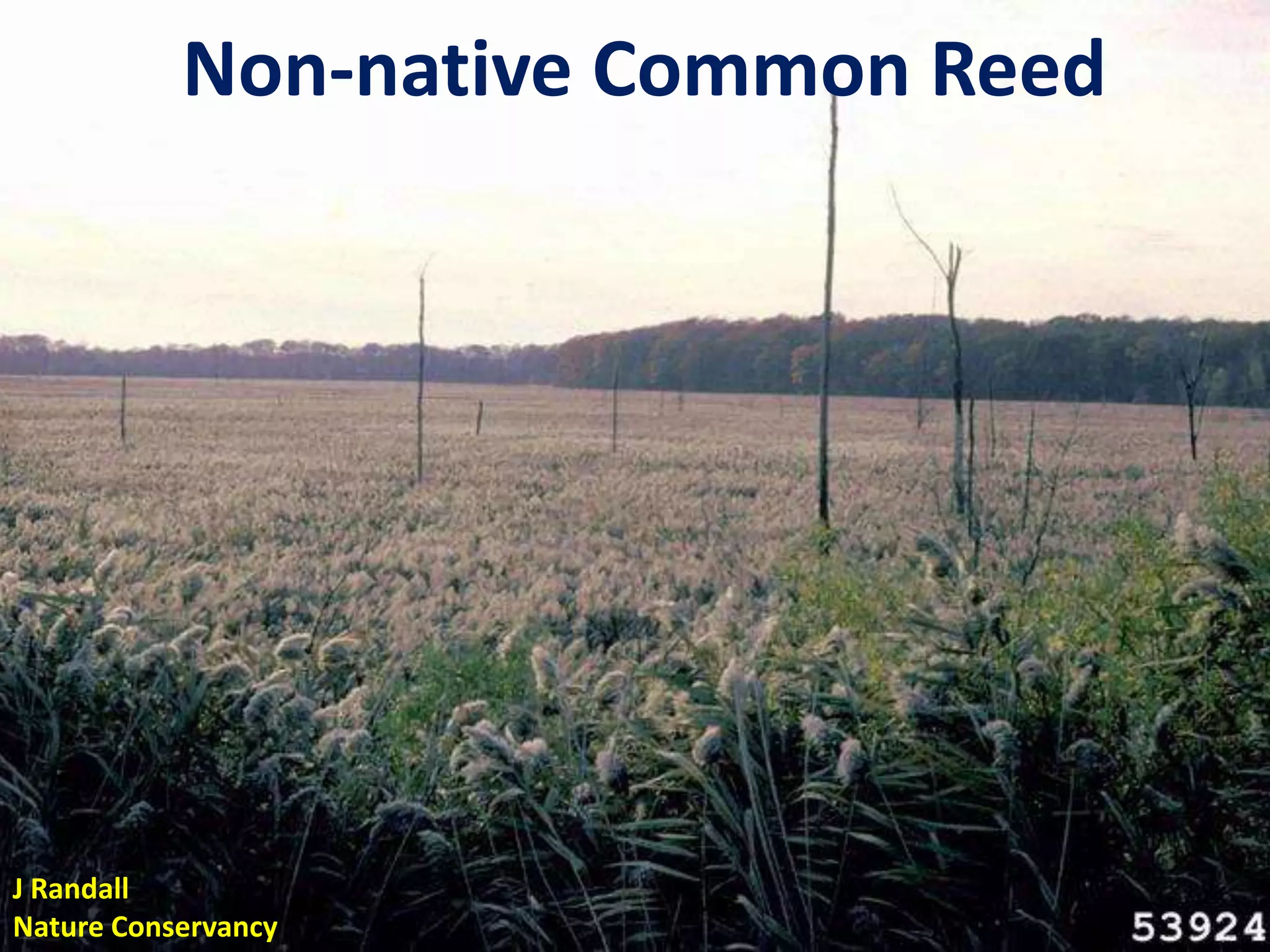 This document discusses the non-native common reed (Phragmites australis), including its invasive characteristics and methods for control and management. The non-native common reed forms dense monocultures that degrade wildlife habitat and increase fire risk. It has competitive advantages over native plants through elevated levels of allelopathic biochemicals. Effective control methods include applying herbicides like imazapyr and glyphosate in late summer or fall. Follow-up treatments may use fire or additional herbicides to prevent regrowth. Long-term monitoring is needed to manage the invasive populations over time.