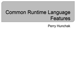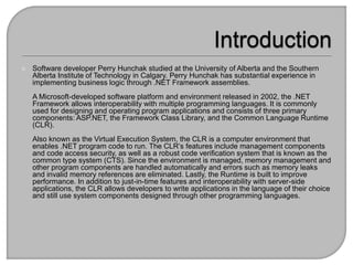 Perry Hunchak is a software developer with education from the University of Alberta and the Southern Alberta Institute of Technology. He has extensive experience with the .NET framework, which enables interoperability across programming languages and consists of components like ASP.NET and the Common Language Runtime (CLR). The CLR enhances application performance while managing memory and preventing common errors, allowing developers to utilize components from various programming languages.