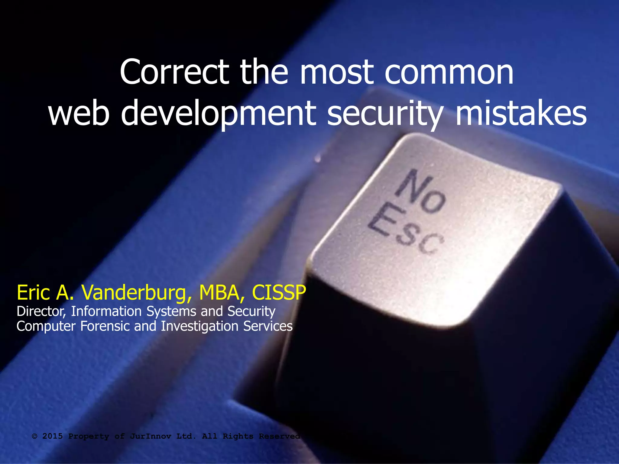 The document discusses common web development security mistakes and how to correct them. It covers security misconfiguration, unrestricted URL access, unvalidated redirects and forwards, direct object references, insecure storage of sensitive data, and insufficient transport layer protection. Mistakes in these areas can allow attackers to access unauthorized data and functionality. The document provides techniques to protect against these risks, such as verifying system configurations, restricting access by URL and role, validating redirect targets, encrypting sensitive data storage and transmissions, and more.