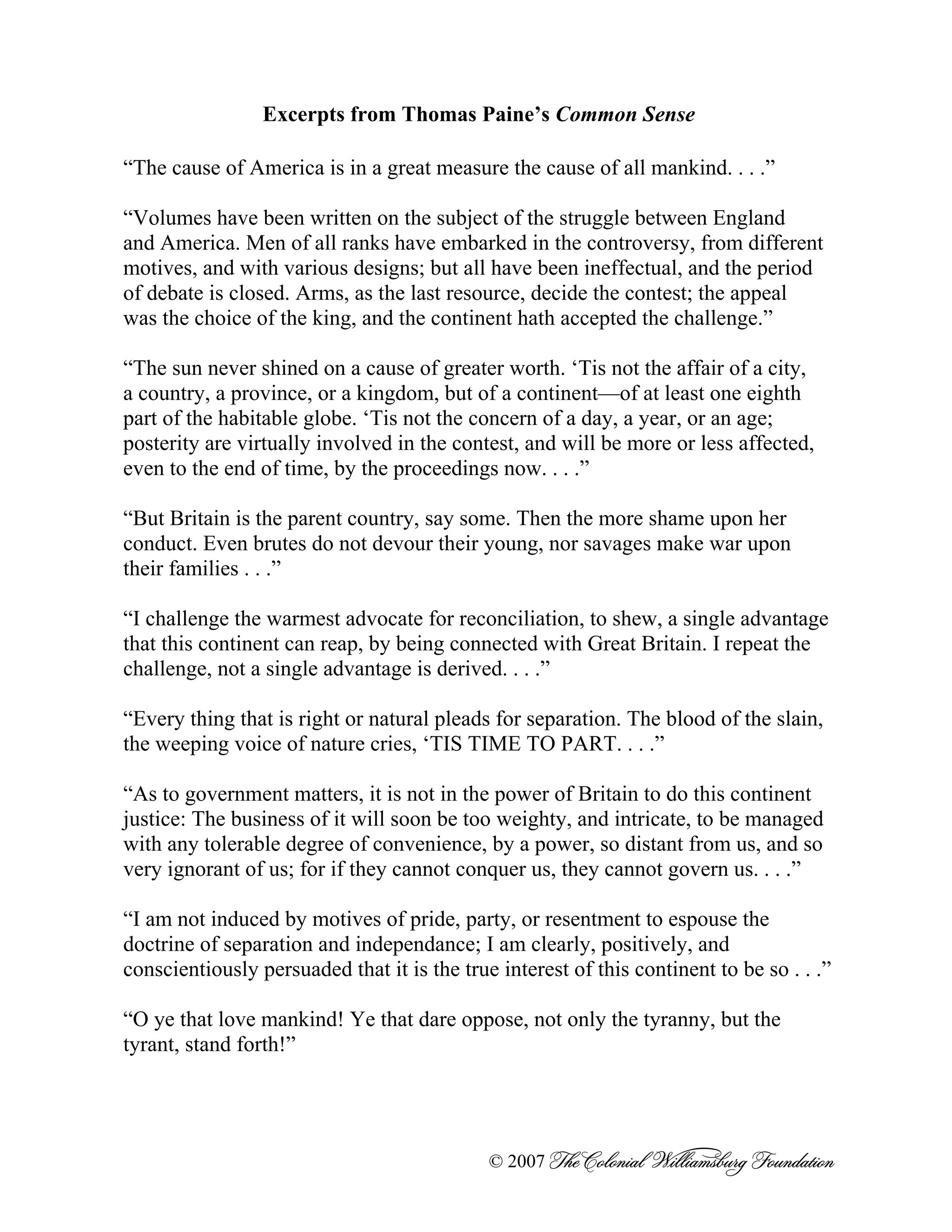 Thomas Paine makes a case for American independence from Britain in his pamphlet "Common Sense". He argues that the cause of America is about more than just a single city or province, but concerns the interests of the entire continent and future generations. While Britain claims to be the parent country, it has not acted as a responsible parent would in making war on its own people. Paine challenges anyone to show a single advantage the continent gains by remaining connected to Britain, saying everything that is right and natural pleads for separation. He believes it is not possible for Britain to govern the continent justly given the great distance and Britain's ignorance of America. Independence, he argues, is in the true interest of the continent.