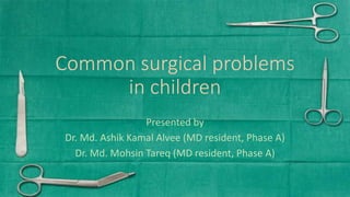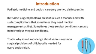 This document summarizes several common surgical problems in children. It discusses conditions like cleft lip and palate, gastroesophageal reflux disease, infantile hypertrophic pyloric stenosis, and Hirschsprung disease. For each condition, it provides information on incidence, clinical features, investigations, and management. The goal is to provide pediatricians with sound knowledge of these common pediatric surgical issues.