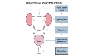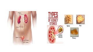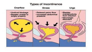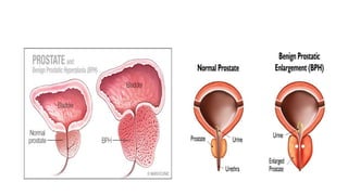 This document provides an overview of common urological problems in men and women. It discusses conditions like benign prostatic hyperplasia (BPH), urinary tract infections (UTIs), kidney stones, and incontinence. For BPH, it describes symptoms like frequent urination and outlines treatment options like drugs and surgery. UTIs are explained as infections caused by bacteria entering the urinary tract, with women more susceptible. Kidney stones form from mineral deposits and cause pain, while incontinence has types like stress and urge incontinence. The document provides details on causes, risk factors, diagnosis, and management of these common urological issues.