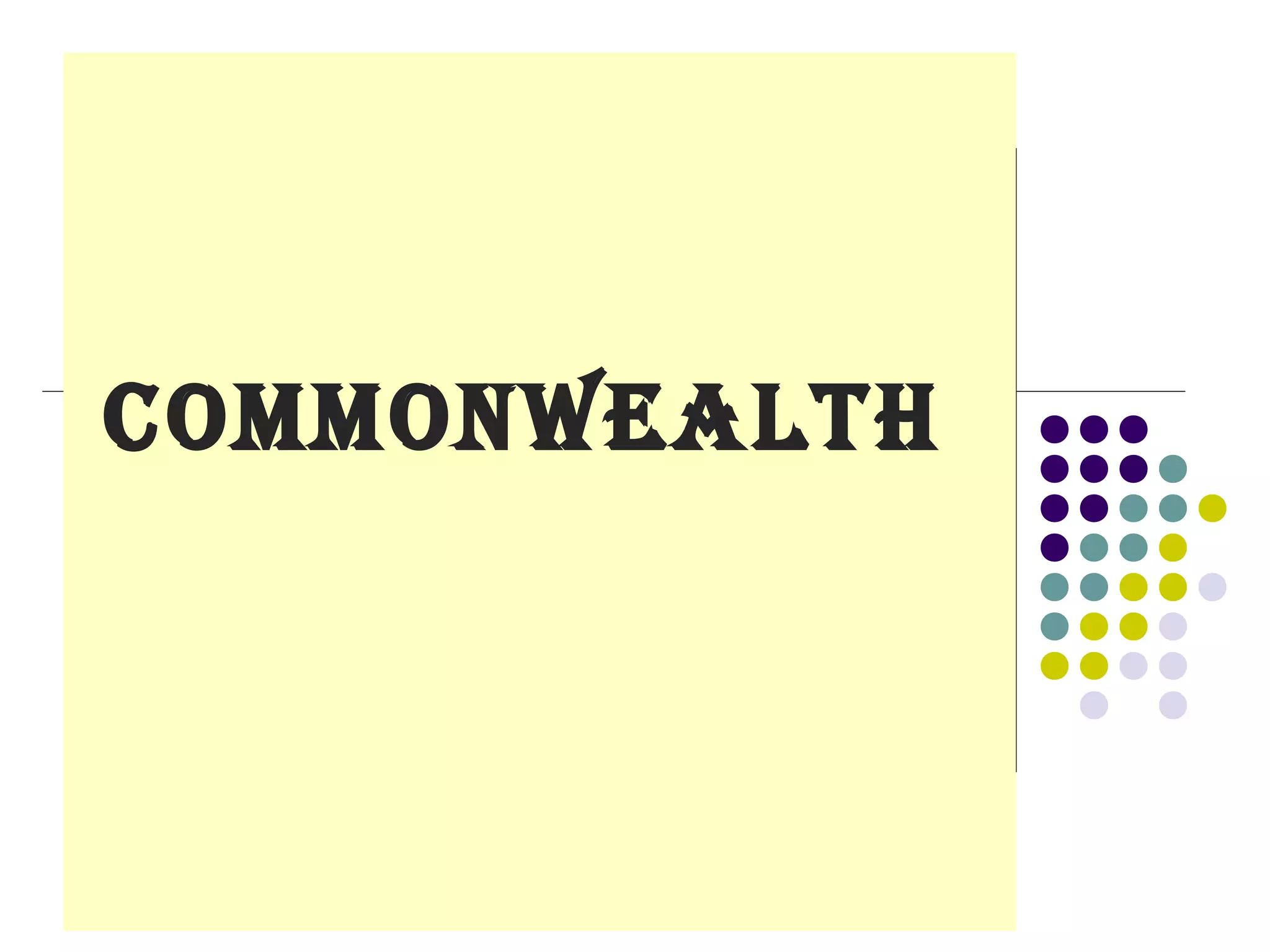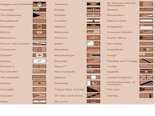 The document summarizes the history and structure of the Commonwealth of Nations. It began in the late 19th century as Britain's colonies gained independence and became dominions with self-government. Over time, declarations established the modern Commonwealth as a voluntary association of equal members united by common values of democracy, human rights, and rule of law. The Commonwealth now includes 53 member countries with over 1.7 billion people. While originally centered around Britain, most members are now republics. The Commonwealth is held together by shared history, language, and democratic traditions, and works to promote prosperity, democracy and international cooperation among its diverse members.
