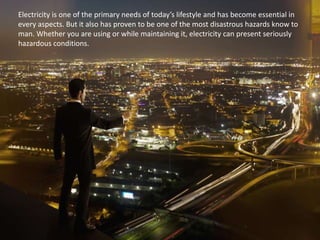 The document discusses common electrical hazards in the workplace, including explosions, fires, electrocution, and burns caused by electricity. It highlights causes such as faulty wiring and neglect of safety regulations, which can lead to severe injuries and deaths. Current Solutions PC offers a 'twelve phase electrical safety program' to protect employees and ensure compliance with safety standards.