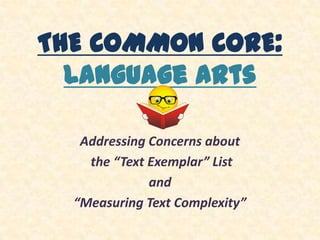 This document addresses teacher concerns about the Common Core State Standards' text exemplar lists and how to measure text complexity. It explains that schools are in the early stages of implementing the standards and are not required to use every text on the lists. It emphasizes bringing more informational texts into the curriculum and using both quantitative and qualitative measures to select appropriately challenging "stretch texts" while providing scaffolding. The document provides examples and clarifies that teachers should use their professional judgment to determine suitable texts for their classes.