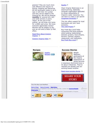 The document outlines the Greener Virginia program aimed at promoting sustainable living among state employees by encouraging practices such as composting and recycling. It provides resources, incentives, and success stories related to eco-friendly initiatives while highlighting the importance of local products and clean waterways. The program also includes cash prizes for participation and aims to foster a commitment to environmental stewardship in the community.