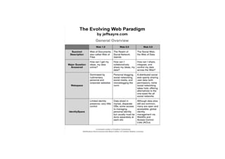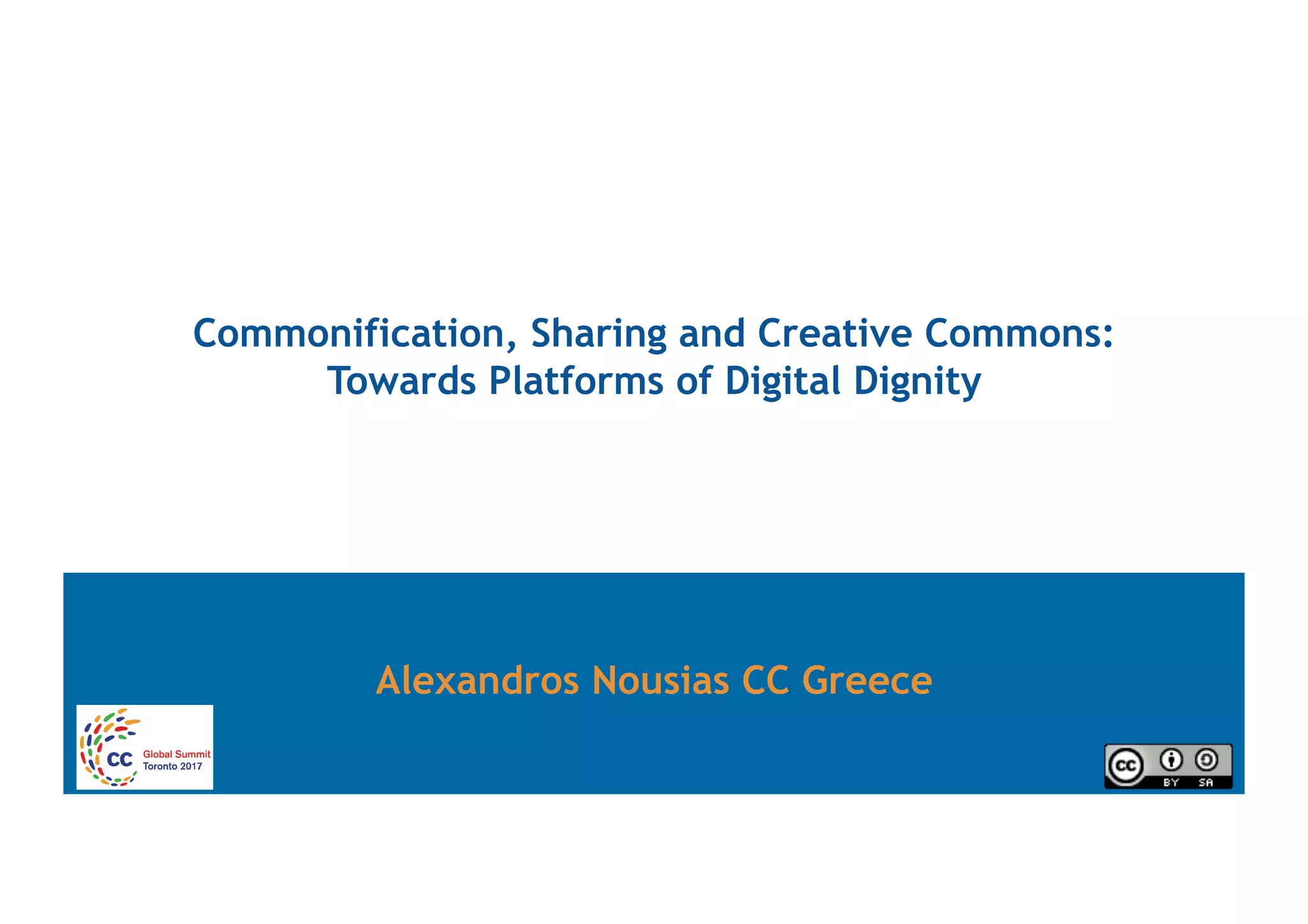 This document discusses commonification, sharing, and Creative Commons as ways to move towards platforms of digital dignity. It argues that open value networks based on cooperation and stewardship of shared assets while respecting individual ownership can help achieve this. Key points discussed are discovery and collaboration using open content, and advocacy for positive policy reforms. The concept of digital dignity is explored, involving both rights to access and use digital resources as well as duties of care, respect, contribution and more. An ethics of the commons is proposed that is human-centric and balances individual autonomy with dynamic social relationships and reciprocities.