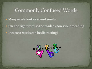 The document provides guidance on the correct usage of several commonly confused word pairs in the English language. It explains the differences between there/their/they're, to/too, its/it's, who/whom, then/than, affect/effect and provides examples to illustrate when each word should be used. The overall purpose is to help the reader distinguish between similar sounding words and use the right word in different contexts.