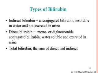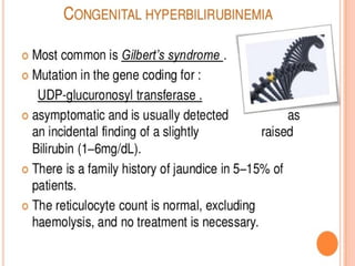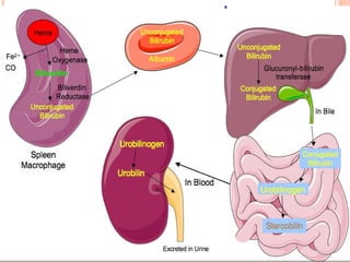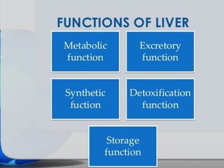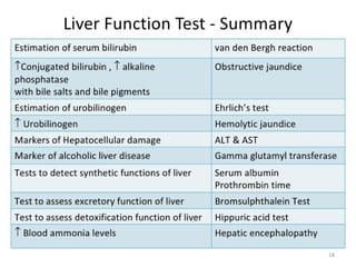 This document provides an overview of commonly performed liver function tests and jaundice. It discusses the structure and functions of the liver, including metabolic, excretory, synthetic and detoxification roles. Key liver function tests are described that evaluate biosynthetic (e.g. albumin, PT), excretory (bilirubin), hepatocellular damage (ALT, AST, GGT), and cholestasis/obstruction (ALP) functions. Bilirubin metabolism and the differences between conjugated and unconjugated bilirubin are explained. The document also covers the types, causes and distinguishing biochemical findings of pre-hepatic, hepatic and post-hepatic jaund