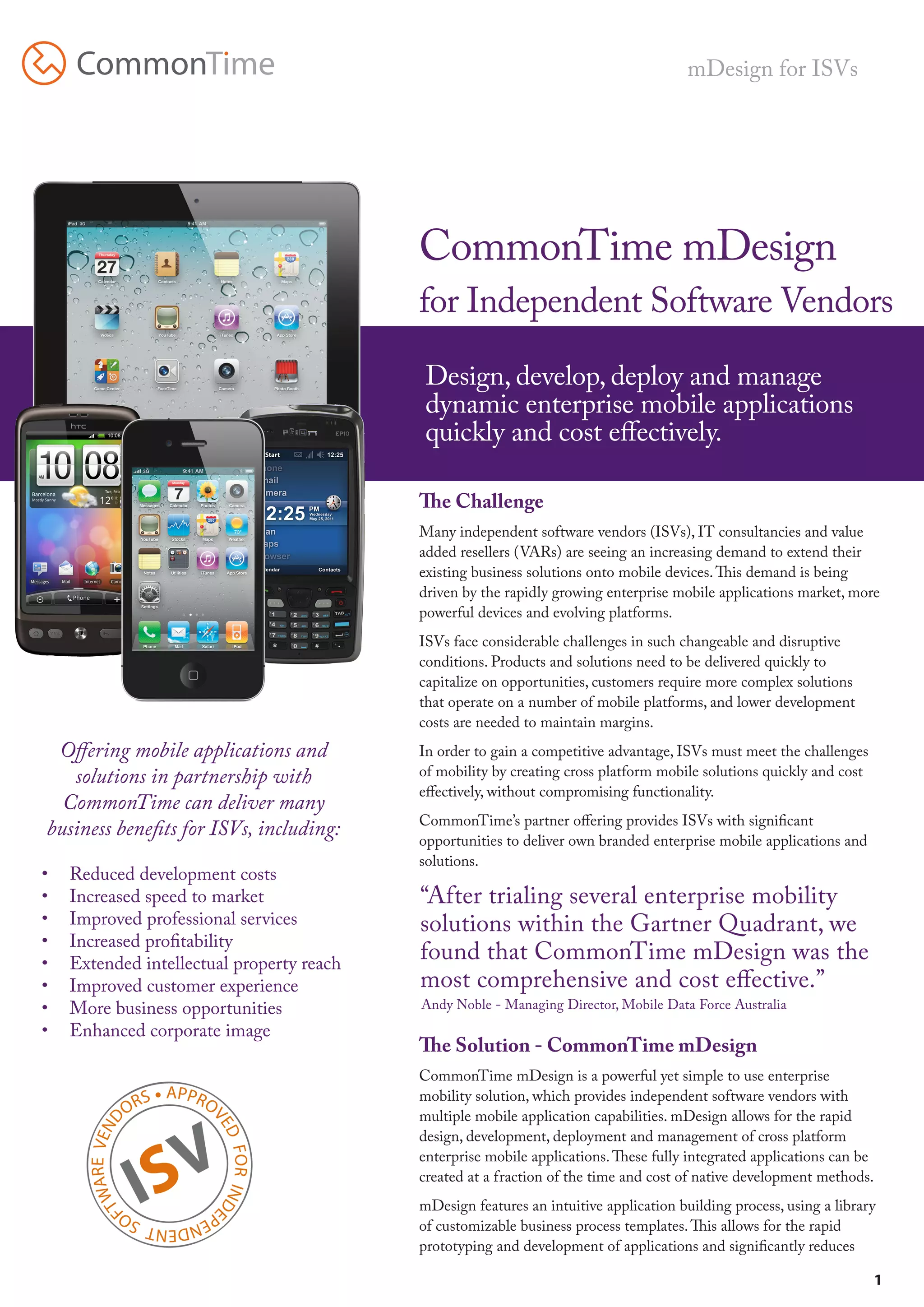 This document discusses CommonTime's mDesign solution for independent software vendors (ISVs) to develop and deploy mobile applications. mDesign allows ISVs to quickly create cross-platform enterprise mobile applications at a lower cost than native development. It features templates for common business processes and integration capabilities. mDesign gives ISVs a competitive advantage by reducing development costs and time to market while allowing them to deliver complex, customized mobile solutions.