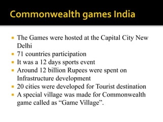 The 2010 Commonwealth Games were hosted in New Delhi, India over 12 days with participation from 71 countries. Around 12 billion rupees were spent on infrastructure development for the Games, including developing 20 cities as tourist destinations and a special "Game Village." Issues around misappropriation of funds estimated at 70,000 crore arose during the preparations and execution of the Games. Suresh Kalmadi, the chairman of the organizing committee, and others were accused of involvement in the Commonwealth Games scam and arrested. An investigation into the irregularities is ongoing.