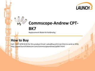 This document provides information about and instructions for purchasing a Commscope-Andrew CPT-BK7 replacement blade kit. It describes the product, including the manufacturer, part number, and specifications. It also details payment and shipping options and provides customer service contact information.