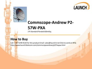 This document provides information about purchasing a Commscope-Andrew P2-57W-PXA 2 ft standard parabolic antenna from Launch 3 Telecom. It describes the product, lists contact information for purchasing, and details payment and shipping options. Launch 3 Telecom offers a warranty, product repair services, and can assist with de-installation, testing, and recycling of telecom equipment.