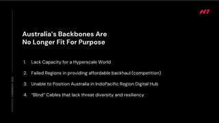 HyperOne aims to build Australia's next-generation hyperscale digital backbone network to address key shortcomings of the country's existing infrastructure. The existing backbone lacks capacity to support growth, particularly in regional and remote areas, and was built for a different time when technologies like cloud computing did not exist. HyperOne will deliver over 10 times the fiber capacity of existing networks and provide over 2,000 off-ramps in regional communities. It will also establish secure connectivity and position Australia as an important digital hub in the Indo-Pacific region.