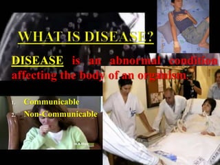 Diseases can be communicable or non-communicable. Communicable diseases spread between individuals through various means like direct contact, vectors/reservoirs, airborne transmission, contaminated food/water, or indirect contact. They are caused by pathogens like viruses, bacteria, parasites, protozoa, and fungi. Factors like environment, culture, and behavior affect disease transmission. Common communicable diseases include the cold, flu, hepatitis B, pneumonia, mononucleosis, chickenpox, and their symptoms, treatments, and means of prevention are discussed.