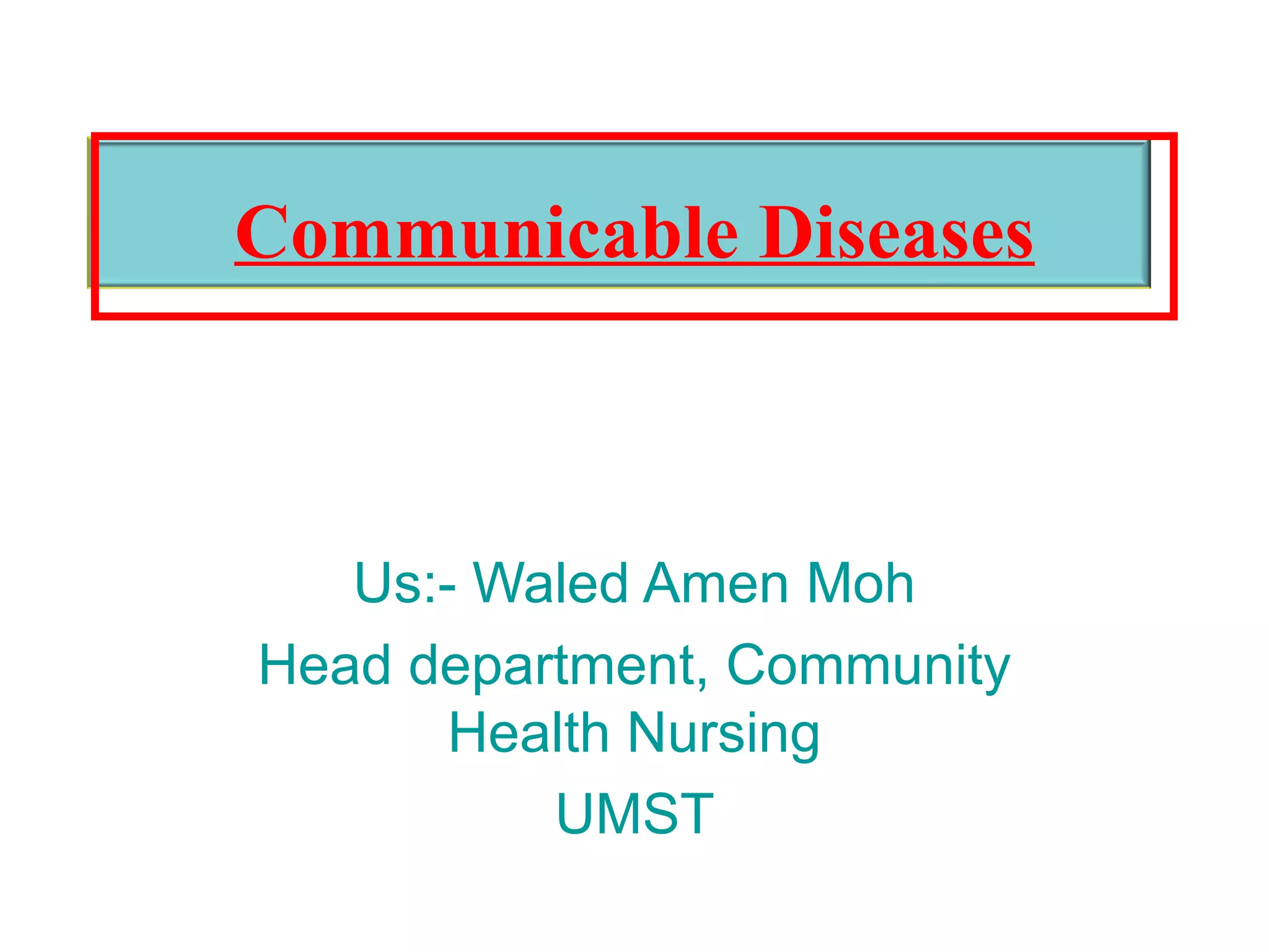 The document discusses communicable diseases, their causes, definitions, outbreaks, transmission, prevention and control. It defines key terms like epidemic, endemic, pandemic, host, carrier, reservoir, vector, immunity and modes of transmission. It outlines steps for managing disease outbreaks including preparation, detection, response and evaluation. It also discusses emerging/reemerging diseases and global disease eradication efforts. Nurses play an important role in communicable disease control through health education, surveillance and working with at-risk communities.