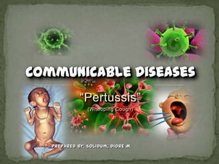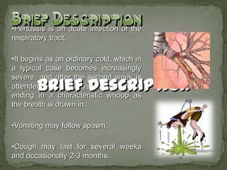 Pertussis, also known as whooping cough, is an acute infection of the respiratory tract caused by the Bordetella pertussis bacterium. It begins with mild cold-like symptoms but progresses to severe coughing fits ending in a high-pitched whoop as the person inhales. Coughing fits can last for several weeks or months. Pertussis is highly contagious and spreads through respiratory droplets. It most severely affects infants under 6 months old. Vaccination is the best prevention through routine DPT immunization of infants and booster shots for children.