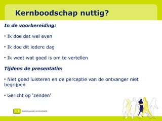 Kernboodschap nuttig? Inde voorbereiding: Ik doe dat wel even Ik doe dit iedere dag Ik weet wat goed is om te vertellen Tijdens de presentatie: Niet goed luisteren en de perceptie van de ontvanger niet begrijpen Gericht op ‘zenden’