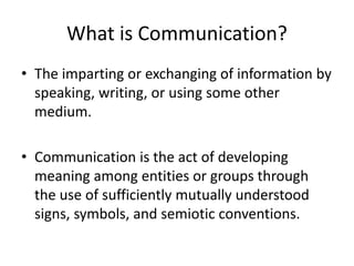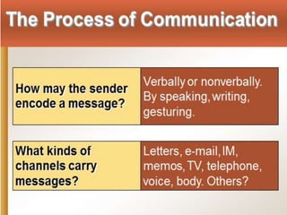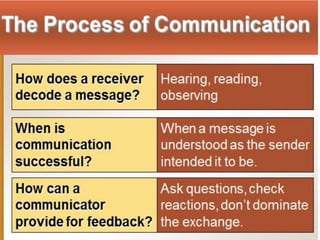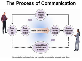 This document discusses communication in the workplace. It defines communication and explains its importance for job placement, performance, advancement and success in the new world of work. It identifies factors like global competition and diverse workforces that affect modern workplaces and require excellent communication skills. The document also outlines barriers to communication like lack of listening skills and provides tips for overcoming them, including encouraging an open environment and improving language skills. It describes formal and informal communication channels in organizations.