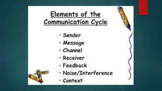 Effective communication requires understanding the emotions behind information, clearly conveying messages while listening to fully understand others, and using engaged listening, nonverbal communication, stress management, and assertiveness. Barriers to effective communication include stress, lack of focus, inconsistent body language, and negative body language. The communication cycle involves a sender encoding a message, sending it through a channel, a receiver decoding the message and providing feedback, with potential noise interfering.