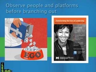 The document is a guide for social media marketing and training, aimed at individuals or small groups, emphasizing the importance of self-awareness, confidence, and respect in online interactions. Key steps for effective community engagement include having clear professional and personal goals, sharing valuable content, and connecting with relevant individuals and organizations. It also advises on maintaining a respectful online presence and managing social media activity effectively.