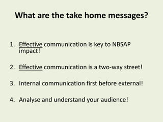 The document emphasizes the critical role of effective communication in the National Biodiversity Strategy and Action Plans (NBSAP), highlighting that it should be a two-way street and start internally within organizations. It provides case studies illustrating the potential conflicts between economic development and the preservation of ecosystem services, stressing the importance of engaging stakeholders through communication, education, and public awareness strategies. Key recommendations include understanding audiences, fostering partnerships, and utilizing effective messaging to influence policy decisions.