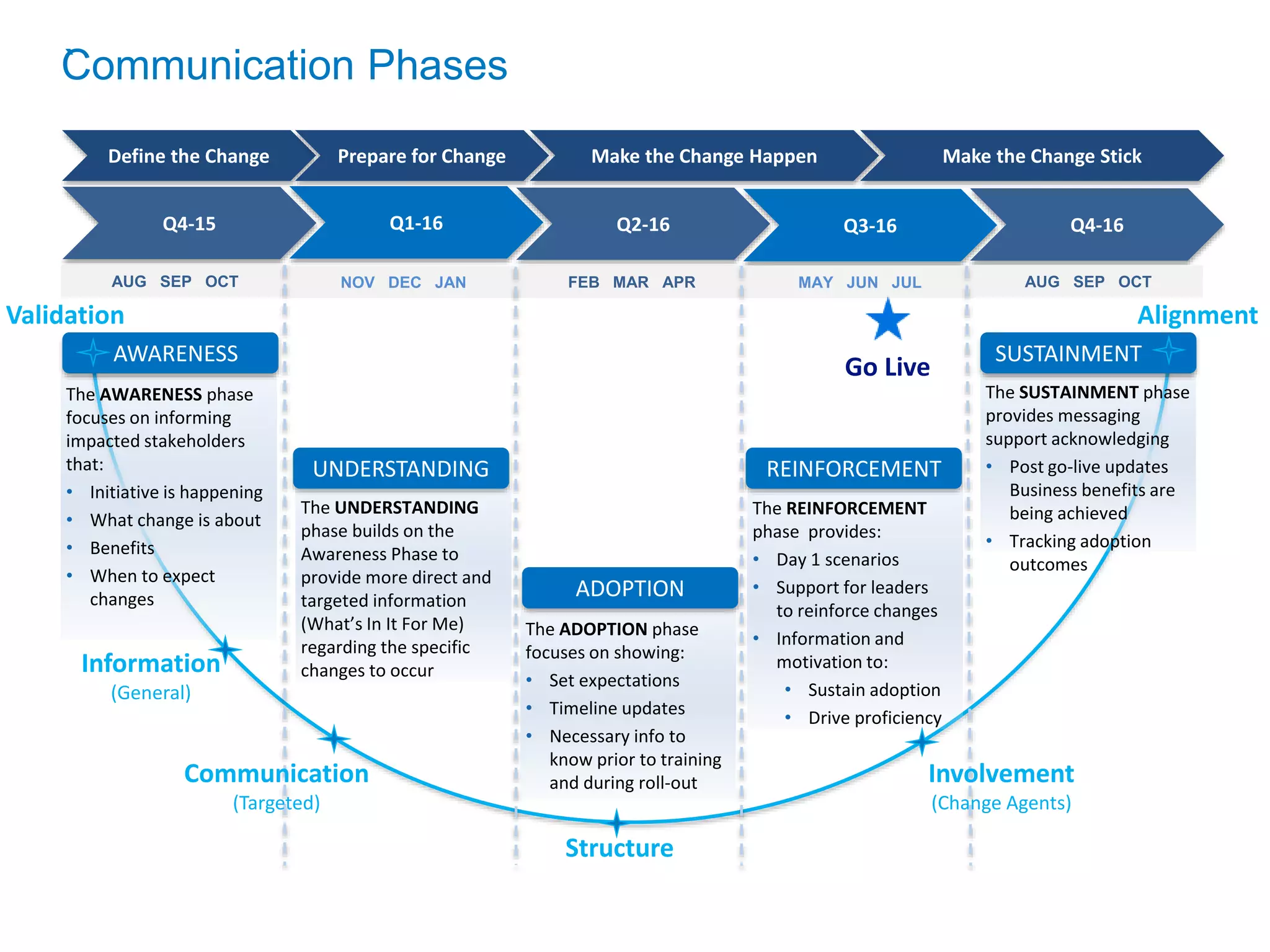 The document outlines a change management communication plan consisting of 5 phases: Awareness, Understanding, Adoption, Reinforcement, and Sustainment. The Awareness phase focuses on informing stakeholders of the upcoming change. The Understanding phase provides more targeted information on the specific changes. The Adoption phase sets expectations and provides necessary information prior to training. The Reinforcement phase provides support to leaders and day 1 scenarios. The Sustainment phase acknowledges benefits achieved and tracks adoption outcomes.