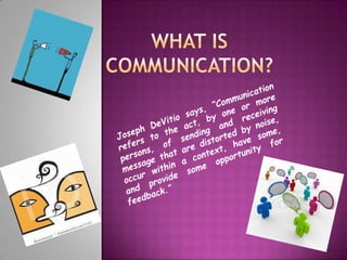 Communication refers to the act of sending and receiving messages between one or more people. The transmission model of communication involves an encoder sending a message through a channel to a decoder. Noise can disrupt the communication process. Verbal communication uses language while nonverbal communication exchanges messages through body language, facial expressions, clothing, and other means. Communication occurs in various environments such as intrapersonally, interpersonally, in small groups, communities, virtually, and through mass communication.
