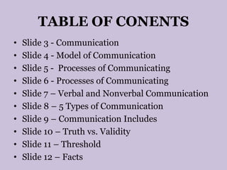 This document discusses various aspects of communication. It defines communication and provides a model of communication that includes a sender, encoding, message, channel, decoding, receiver, and feedback. It discusses verbal and nonverbal communication. It outlines five types of communication: intrapersonal, interpersonal, small group, public, and mass communication. It also discusses what communication can include, the differences between truth and validity, and the concept of threshold in decision making.