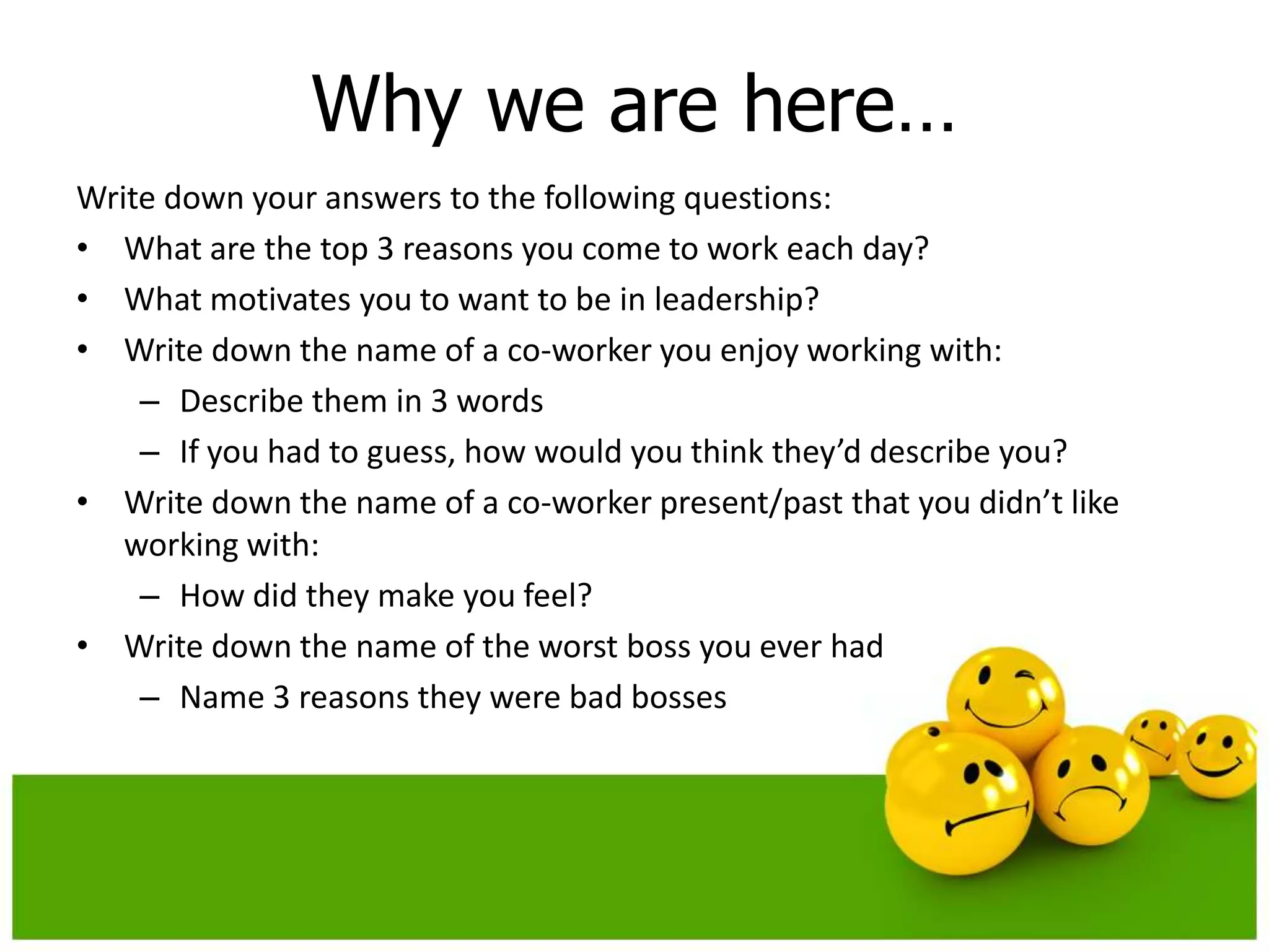This document provides guidance on effective communication skills. It discusses the importance of first impressions and suggests ways to make a positive first impression through appearance, body language, tone of voice, and active listening. It also discusses how to handle difficult realities or feedback by using the C.A.P.S. method of catching what is said without reaction, absorbing the true meaning, perfecting a response, and sending it back in a constructive way. The document provides examples of how to communicate effectively with direct reports, peers, managers, and senior leadership through written and verbal communication. It emphasizes staying positive, validating others' perspectives, and avoiding entitlement, argumentativeness, arrogance, or silence.