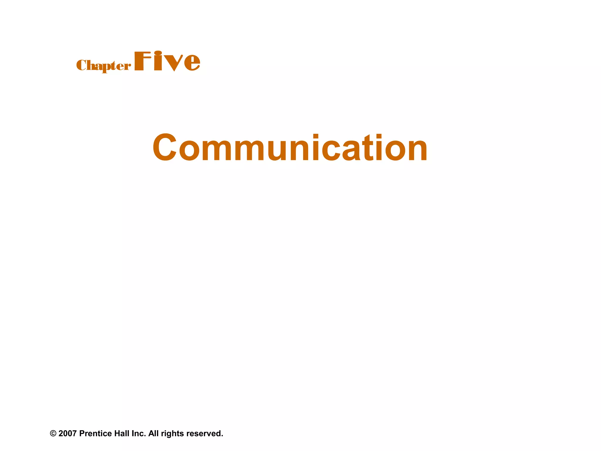 The document discusses key aspects of communication in organizations. It covers functions of communication like controlling behavior and providing motivation. It also outlines the communication process, including elements like the sender, message, channel, and receiver. Different types of communication channels and their characteristics are examined as well.