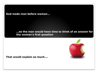 Men and women approach problem solving and communication differently. While their goals may be similar, women tend to consider relationships and personal experiences, thinking about problems holistically. Men separate problems and solutions from personal issues, focusing on one problem at a time. These differences can lead to misunderstandings, as women may communicate nonverbally and value discussion, while men separate emotions from conversations. Learning to accept gender differences is important for healthy relationships.