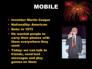 The document discusses three important communication inventions: mobile phones by Martin Cooper which allowed portable telephony, radio by Guglielmo Marconi which enabled transatlantic wireless communication, and email by Ray Tomlinson which launched the first electronic message between computers. These inventions transformed communication by allowing people to stay connected through voice calls, music, messages and information across vast distances both near and far.