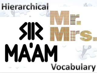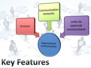 The document discusses hierarchical communication within organizations, including internal and external communication. It addresses different types of communication like personal, task-based, and social communication. It also mentions concepts like roles, rules, policies, communication networks, and codes of conduct that shape organizational culture and specify how communication should occur.