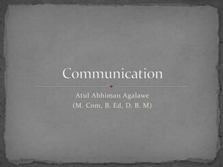 The document defines communication and describes its key components: sender, message, encoding, channel, receiver, decoding, and feedback. It then discusses various traditional and modern means of communication, focusing on mail/postal services and their types (mail services, specialized services, financial services, retail services). Telephone and wireless communication methods are also summarized, including mobile communication, broadband, and Indian satellites.