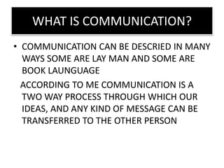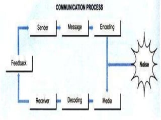 The document discusses communication as a two-way process involving a sender and receiver, highlighting important elements such as encoding, decoding, media, and feedback. It emphasizes the significance of effective communication in organizations for coordination, decision-making, and motivation, while also detailing formal and informal communication forms. Additionally, the document addresses barriers to communication and provides tips for improving communication effectiveness.
