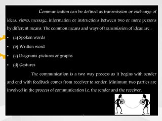 The document outlines the communication process, emphasizing its two-way nature involving a sender and a receiver. It describes the key elements of communication such as encoding, media, decoding, feedback, and noise, alongside formal and informal communication types within organizations. Additionally, it highlights the various forms of organizational communication, including downward, upward, horizontal, and diagonal communication, as well as different communication networks.
