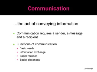 Communication requires a sender, message, and recipient. It fulfills basic needs, exchanges information, and fosters social closeness. Receptive communication is what is received and understood from others through schedules, social stories, and behavior cards, while expressive communication conveys meaning to others using choice boards, PECS, or devices. Augmentative and alternative communication supports or replaces speech using pictures, signs, gestures, or devices. Preparing students for the Florida Alternate Assessment requires determining and practicing their mode of communication while using consistent language and providing multiple means of response. Meeting student needs is based on understanding behaviors, building skills, antecedents, consequences, environment, staff responses, and integrated experiences using nonviolent crisis